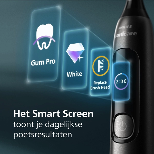 De Philips Sonicare 6800 HX3792/11 is een slimme sonische elektrische tandenborstel die ontworpen is met de nieuwste poetstechnologie. Het ingebouwde slimme scherm geeft direct feedback over je poetsdruk, tijdsduur, de batterij en meldt zelfs wanneer de borstelkop moet vervangen. Met één druk op de knop krijg je alle belangrijkste meldingen voor een betere poetsgewoonten aangereikt, zonder dat je een app hoeft te installeren.